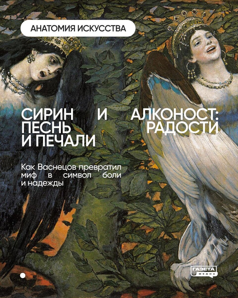 Гармония света и тьмы на одном холсте Виктор Васнецов умел рисовать не только былинных богатырей, но и заглядывать в мир легенд. Его картина «Сирин и Алконост. Песнь радости и печали» (1896) — это встреча с двумя загадочными женщинами-птицами. Произведение написано в переломное время — в ее красоте чувствуется тревога за будущее страны, и одновременно вера в то, что испытания можно пережить. Это не иллюстрация к мифу, а философская притча о жизни. Васнецов превращает древний миф в символ России на пороге перемен, показывая хрупкий баланс между болью и надеждой. Сегодня «Сирин и Алконост» хранится в Третьяковской галерее. Рекомендуем посетить музей и посмотреть на нее вживую: никакая фотография не передаст той силы, которую вложил туда Васнецов. #газета_культурный_код #газета_анатомия_искусства