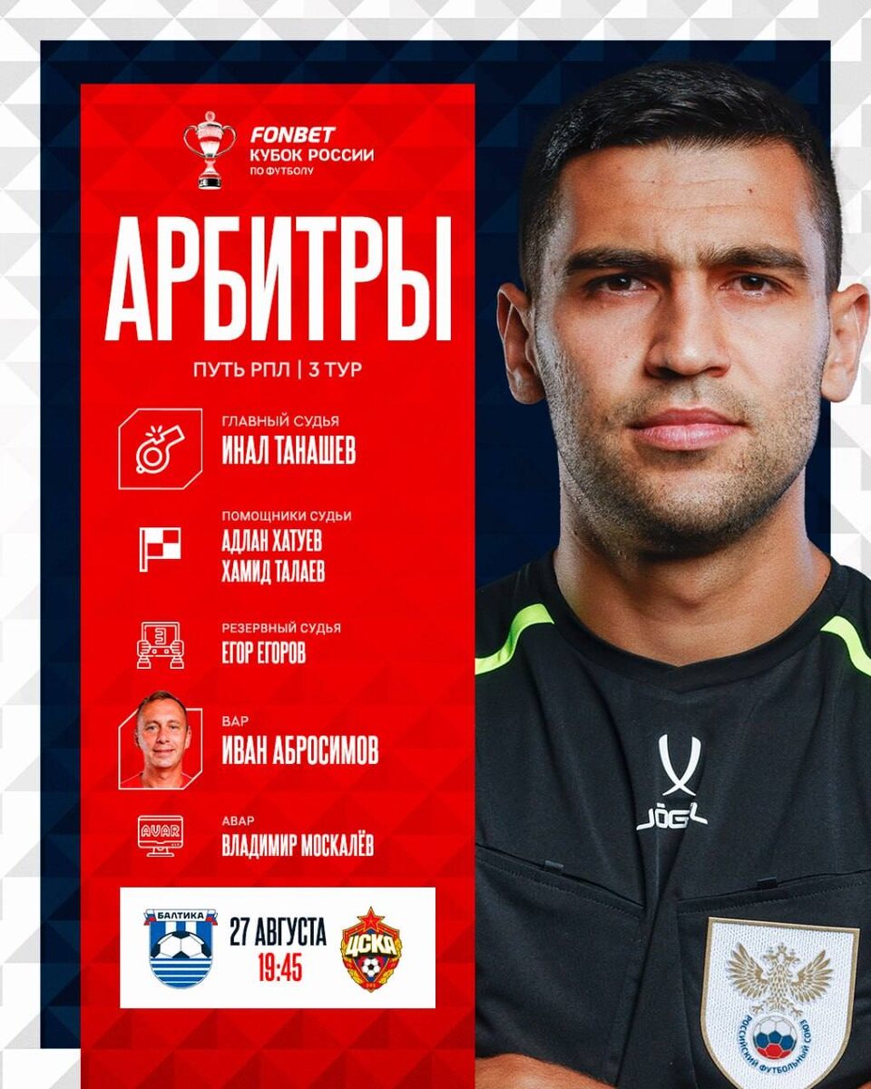 На матч третьего тура группового этапа Пути РПЛ FONBET Кубка России назначена следующая бригада арбитров: 🚩 Главный арбитр матча — Инал Танашев; 🏳 Ассистенты судьи — Адлан Хатуев, Хамид Талаев; 📺 VAR — Иван Абросимов; 👀 AVAR — Владимир Москалёв; ✍🏻 Инспектор — Эдуард Малый. В качестве главного судьи Инал Адальбиевич работал на трех матчах «Балтики», в которых наша команда трижды одержала победу. В этих встречах было показано четыре желтые карточки.