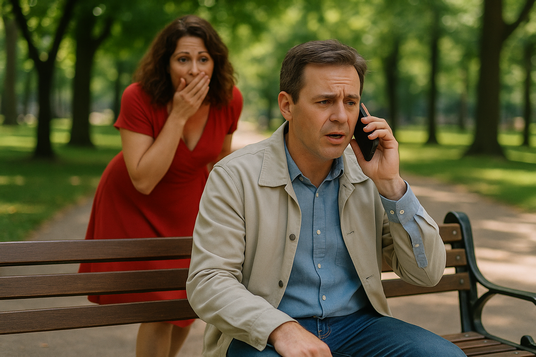 Лера шла по улице и увидела на скамейке в парке ее мужа Диму, который разговаривал по телефону.