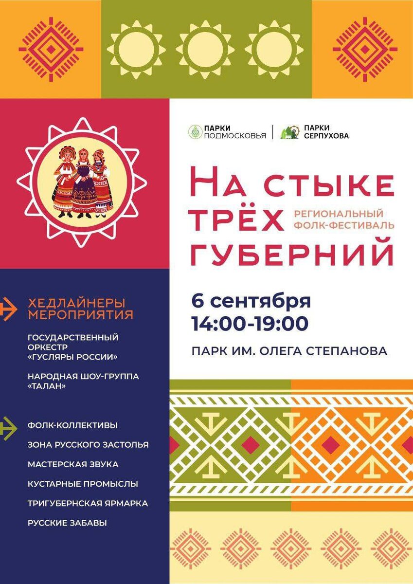 В ближайшую осеннюю субботу, уже в восьмой раз, город Серпухов превратится в центр притяжения поклонников народного творчества, где состоится региональный фестиваль фольклора «На стыке трех губерний». 🎀Фестиваль призван познакомить жителей и гостей округа с богатым культурным наследием не только Подмосковья, но и соседних Тульской и Калужской областей. ✅6 сентября в парке им. Олега Степанова гостей ждет насыщенная программа: старинные игры и развлечения, площадки ручного промысла, музыкальная зона и угощения, а также выступления местных фольклорных коллективов. 🎶Главными звездами фестиваля станут Государственный оркестр «Гусляры России» и народная шоу-группа «Талан». 📚Сохранение традиций, поддержка талантов и развитие туризма – приоритеты культурной политики Серпухова. ✨Приглашаем всех 6 сентября в парк им. Олега Степанова, начало в 14:00, чтобы вместе разделить радость творчества и народного единства!