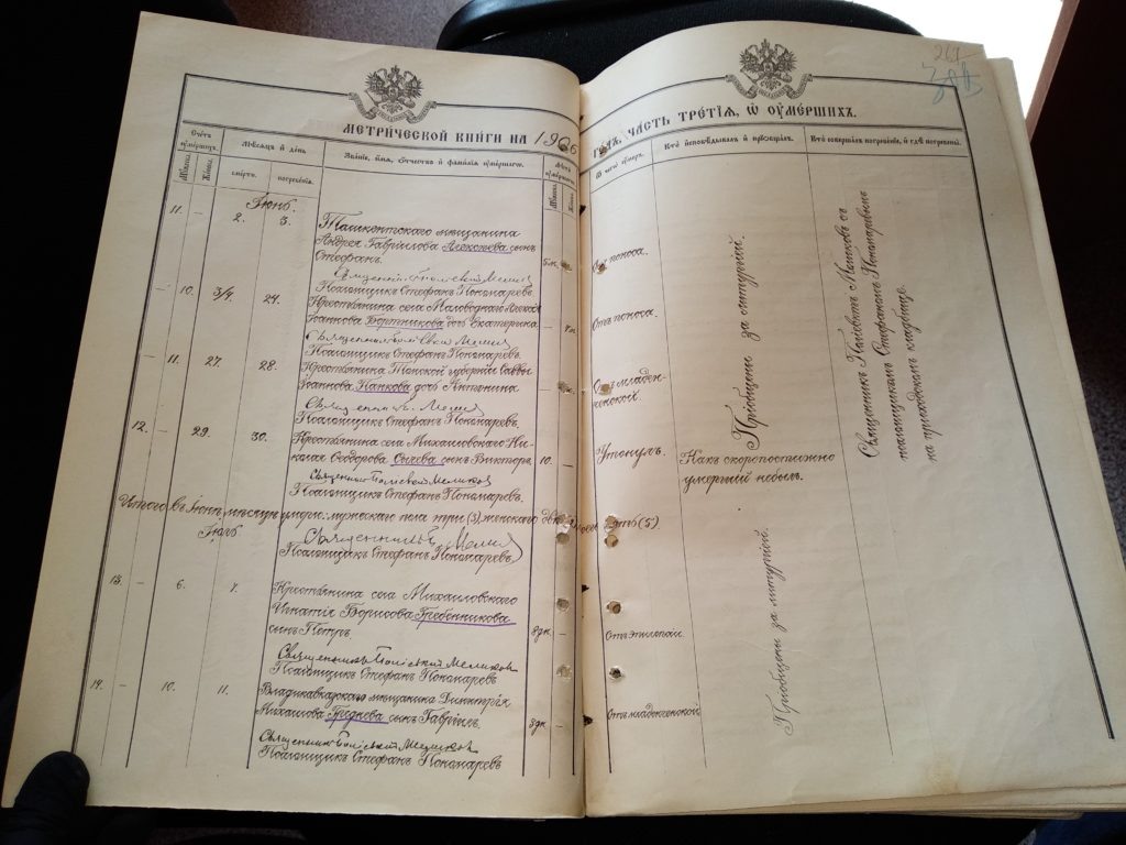 - Об умерших. В этом разделе фиксировался возраст усопшего и причина его смерти. Разумеется, не стоит ожидать здесь точных медицинских диагнозов. Причины смерти описывались терминами той эпохи: «от старости», «от горячки» (лихорадки), «от кашля» или «младенческой слабости».