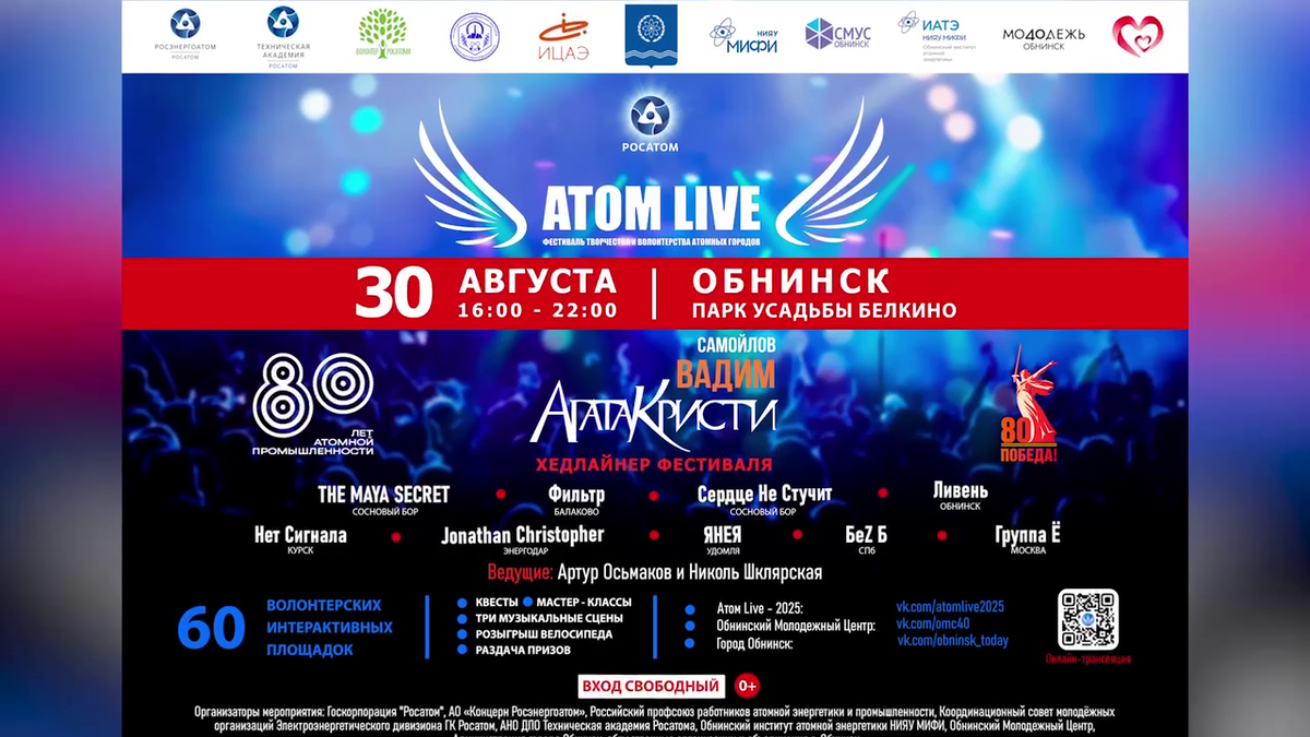 В Белкинском парке 30 августа с 16:00 до 22:00 пройдёт фестиваль творчества и волонтёрства атомных городов Атом-Live 2025, приуроченный к 80-летию Победы в Великой Отечественной войне и 80-летию атомной отрасли.