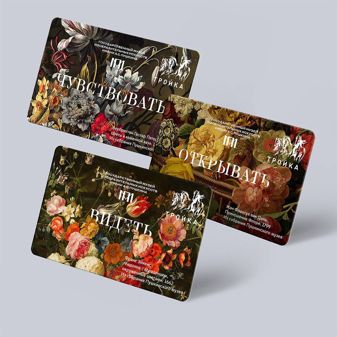 Видеть. Чувствовать. Открывать Пушкинский музей совместно с Департаментом транспорта города Москвы выпустили тематическую серию карт «Тройка» под названием «Видеть. Чувствовать. Открывать». Тема серии — пышные цветы как символ уходящего лета и аллегория быстротечности жизни. В оформлении карт использованы фрагменты таких натюрмортов как как «Мадонна с младенцем, окруженные цветами» (1662) Франса Эйкенса, «Цветы в каменной вазе» Гаспара Петера Вербрюггена Младшего, «Приношение Флоре» (1799) Жана Франсуа ван Даля.