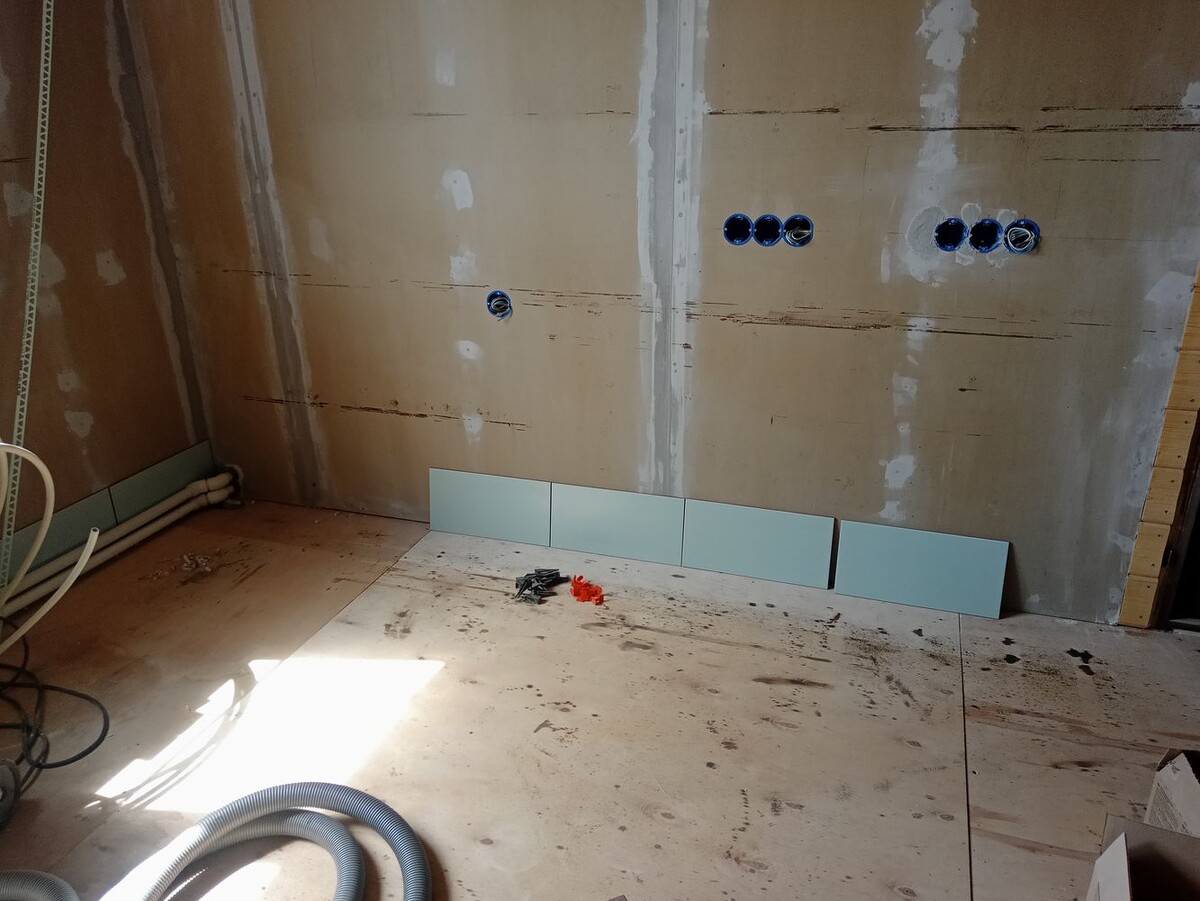 Отделка медленно (порой даже очень) но верно движется вперёд. И настало время фартука на кухне. Стены на кухне у меня из имитации бруса а вот угол где будет стоять (хотя уже почти стоит) кухонная мебель планировал выложить плиткой. Оно в плане практичности и чистоты удобно, да и зону готовки выделяет. Изначально данный угол я закрыл ГКЛ, который естественно загрунтовал. Когда разводил электрику, то розетки планировал под плитку 40х20 и почти везде угадал, кроме одной. После долгих мук выбора, купил плитку с расцветкой Мята. Плитка гладкая, что удобно при наведении чистоты. Для укладки плитки использовал: