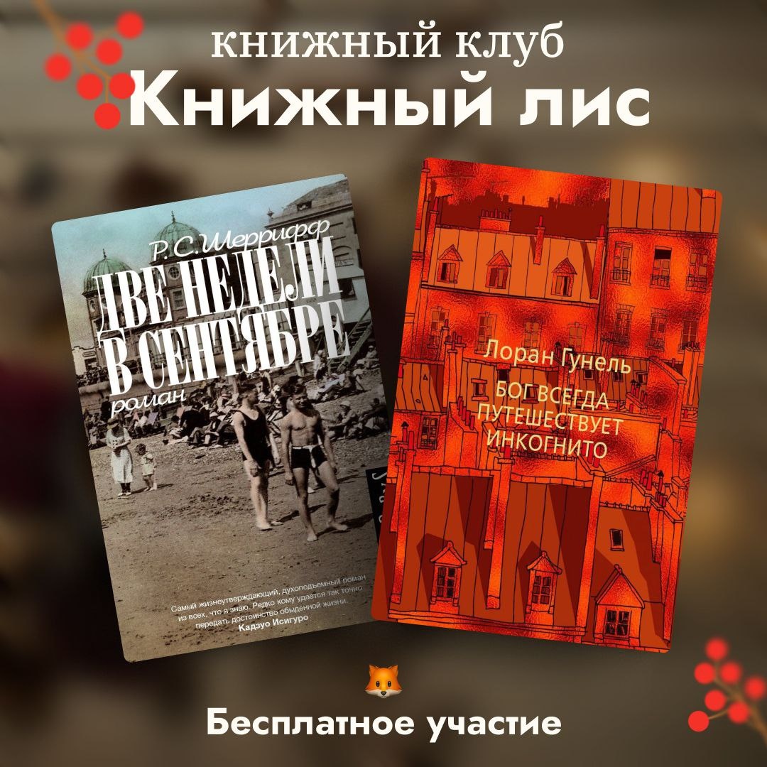 😈😈😈😈😈😈😈 😈😈😈😈 🔥Объявляем старт для заявок на читательский сентябрь в книжном клубе «Книжный Лис»! В сентябре читаем: ◾️Роберт Шеррифф. Две недели в сентябре ◾️Лоран Гунель. Бог всегда путешествует инкогнито Факультативно (параллельно с двумя основными книгами) в этом месяце читаем: 🔶Александр Дюма. Граф Монте-Кристо Вы сами приобретаете книги в удобном для вас формате. Мы добавим вас в закрытый чат, где все участники клуба будут вместе читать и обсуждать два произведения + факультативное в отдельном диалоге. 💡Чтобы записаться в клуб на сентябрь, напишите, пожалуйста, в личные сообщения мне @zanoza_books ✅Старт 1 сентября (во второй половине дня). Участие бесплатное!