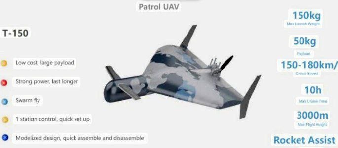 Наиболее вероятно, что речь идёт о БПЛА-"камикадзе" T150, которые ранее уже были замечены на подлёте к Алабуге. Как ранее отмечало "Русское оружие", данные тяжелые дроны типа "бесхвостка" отличаются от наших "Гераней-2" законцовками большого удлинения, а также неподвижным передним горизонтальным оперением, обеспечивающим дополнительную подъёмную силу впереди центра масс планера, где расположены боевая часть и БРЭО. Дальность действия дронов данного типа может достигать 1500 - 1800 км.