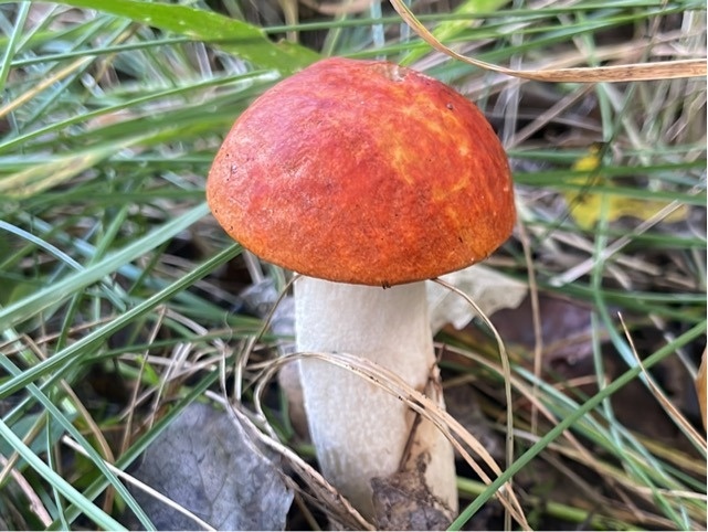 На представленном изображении, вероятнее всего, изображен подосиновик, также известный под научным названием [Leccinum aurantiacum]. Основанием для такого вывода служит ярко-оранжевая или красноватая шляпка, характерная для этого вида, а также светлая, утолщенная книзу ножка. Шляпка у подосиновика выпуклая, может достигать достаточно больших размеров. Мякоть белая, на срезе гриб темнеет, приобретая синеватый или черноватый оттенок. Подосиновик – это съедобный гриб. Он ценится за свой вкус и питательные свойства. Его можно употреблять в пищу в жареном, вареном, маринованном или сушеном виде.