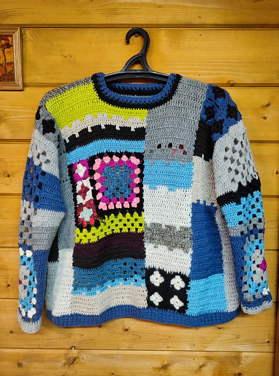 В конце лета появился он, совершенно неожиданно:)). Мой 100500 джемпер:). Но он такой один. Совершенный эксклюзив. Не для всех и каждого, а для ярких личностей:).На нём нет ни одного одинакового участка, даже рукава хоть и похожи, но разные. При кажущейся простоте очень сложная работа. Не для новичков. Все крючком 2,5.