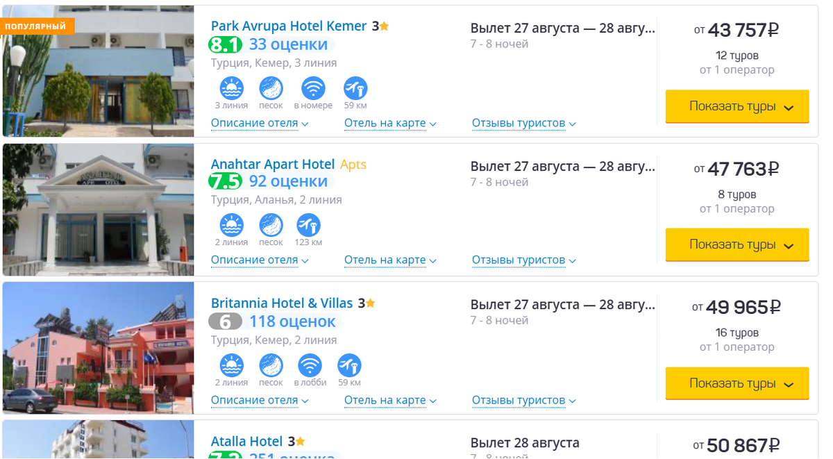Абхазия от 38 т.р. с перелетом из Москвы, пакетный тур на неделю за двоих. И бонусом, сколько стоят горящие туры в Венесуэлу, на прямых рейсах. Не удивляйтесь, уже туристы летают с начала августа. Как я всегда отмечаю в своих публикациях, что БГ всегда может опустить ценник ниже любых конкурентов, если ему необходимо заполнить пустующие борта. Так и произошло, предсказуемо, если БГ пару дней назад еще выжидал то вот и настал момент, который продлится буквально несколько дней, когда мы видим цены на горящие путевки в Турцию ниже 50 т.р. на двоих, с вылетом завтра, от 43 т.р., Но проживание в отеле без питания Но зато перелет, как обычно у БГ, Аэрофлотом, с полноценным багажом, за выбор рейса - доплата 16 т.р., но делать это не обязательно Отели на олл инклюзиве сегодня можно найти от 56 т.р., но еще не поздний вечер, возможно, что к полуночи еще упадет, а вчера видел и 48 т.р. на двоих, вылет 26 августа у Анекса за 51 т.р. ФанСан, тот же уровень Конкуренция между туроператорами