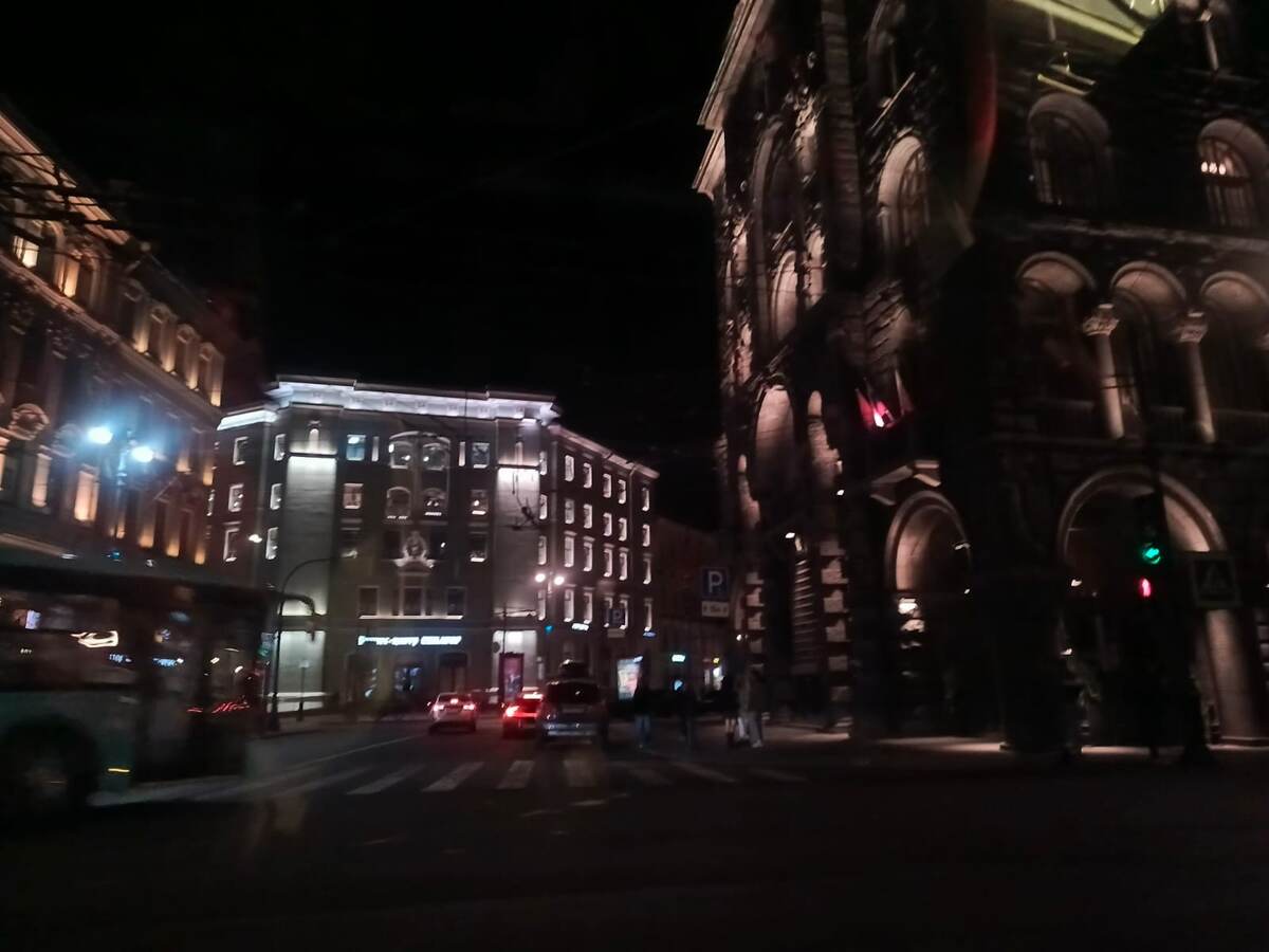 Когда вы въезжаете ночью в Питер, он встретит вас кромешной тьмой и в то же время яркими огнями. Город оживлён и ночью. Фотографии делала моя подруга Ольга. Которая в Питере была впервые. Эмоции зашкаливали. Да не удивительно. Это же прекрасный город с большой историей. И красивой архитектурой, которая скрыта внутри города подальше от проспекта и оживлённых дорог. Это подмечу, где то второй час ночи. Здесь уже, окунаемся в дневной Питер. По сравнению с нашим городом. Питер величественен и высок. 20 этажки для нас действительно диковинка. Не сказать, что на улицах вау. Пока едешь ничего особенного. Питер уникален своими двориками внутри. Вдали от дорог. Своими дворцами и Петергофом. По дороге, дом сменяет за домом. Все высокие. И что удивило. Не смотря на то, что огромное население в Питере, на дорогах гораздо спокойнее и безопаснее по сравнению с нашей областью. По крайне такое мнение возникло, пока находились в Питере. Небо отражается во всех окнах домов и за счёт этого кажется, что