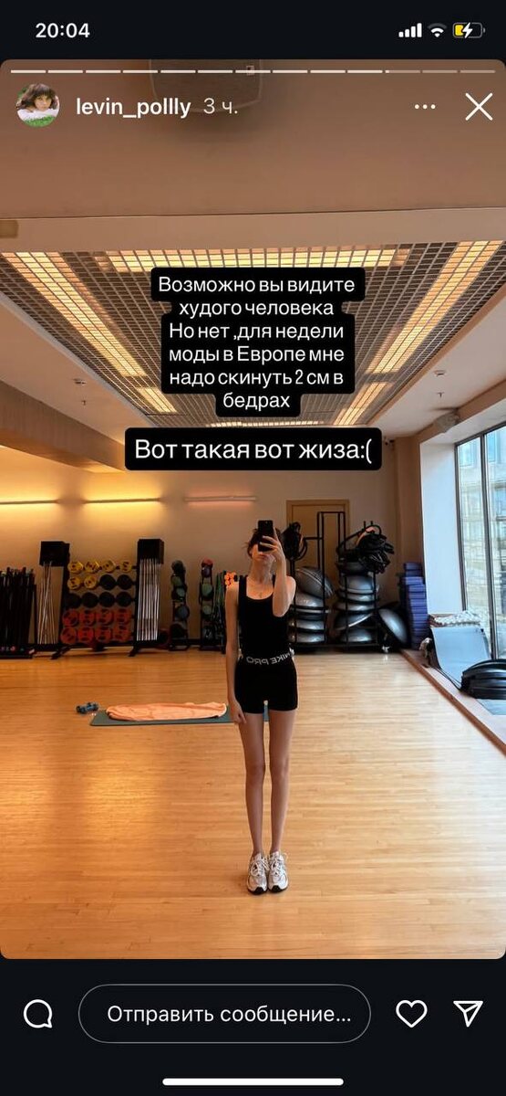 Как быстро мы вернулись к экстремальной худобе. Модель Полли Левин (к слову, любимка Эди Слимана, у нее несколько сезонов был эксклюзив с Celine) делится, что для участия в неделе моды в Европе ей надо похудеть. UPD: Если вдруг кому интересны цифры: с 90 см в бедрах до 87-88. @make_your_style