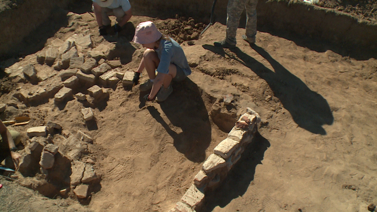 «Здесь мы видим стену из сырцового, необожженного кирпича. К ней пристроена стеночка из обожженного. И самая непонятная – выложенная кирпичом, видимо внутри помещения площадка, примерно метр на метр, и какой-то завал кирпича над ней, как будто колонна стояла», – рассказывает историк Федор Ермолов.