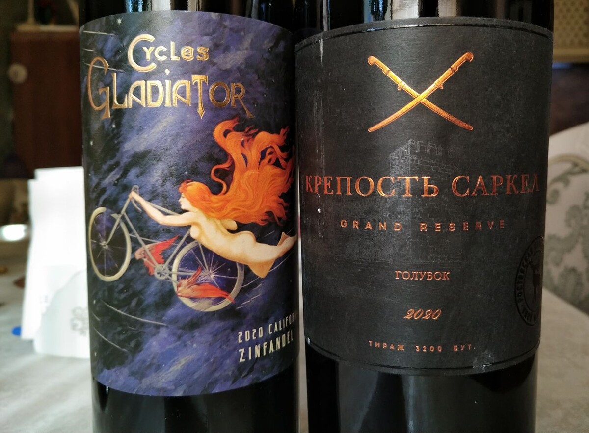 Вино "дети до 18", впрочем, как всегда, но тут ещё игривая этикетка с мото- или велогладиатором-дамой. На что я и купился. Так как это зинфандель, то подобрать ему оппонента среди наших вин затруднительно, значит, в сравнении будет сорт, к которому сложно подобрать оппонента среди зарубежных вин. Представляю участников. Калифорнийский (США) Cycles Gladiator от "Винных хулиганов" (Wine Hooligans) - зинфандель 2020 года, сухое вино, что надо уточнить, потому что полусухих зинфанделей больше, чем сухих. Дара розлива сентябрь-2022. В взял за 2,5 тысячи - американские вина сейчас особенно дороги. "Крепость Саркел Голубок Гран Резерв" от "Цимлянских вин", сорт голубок тоже урожая 2020 года, розлив август-2022. Когда-то взял за 2,4 тысячи, потом видел за 2,8 тысячи. Вино уже было у меня в блоге и произвело очень хорошее впечатление. Поехали! Cycles Gladiator В первый день узнаваемый сортовой аромат и вкус, ассоциирующийся у меня с чем-то еловым, ну, помимо почти обязательных ягод. Не так, что