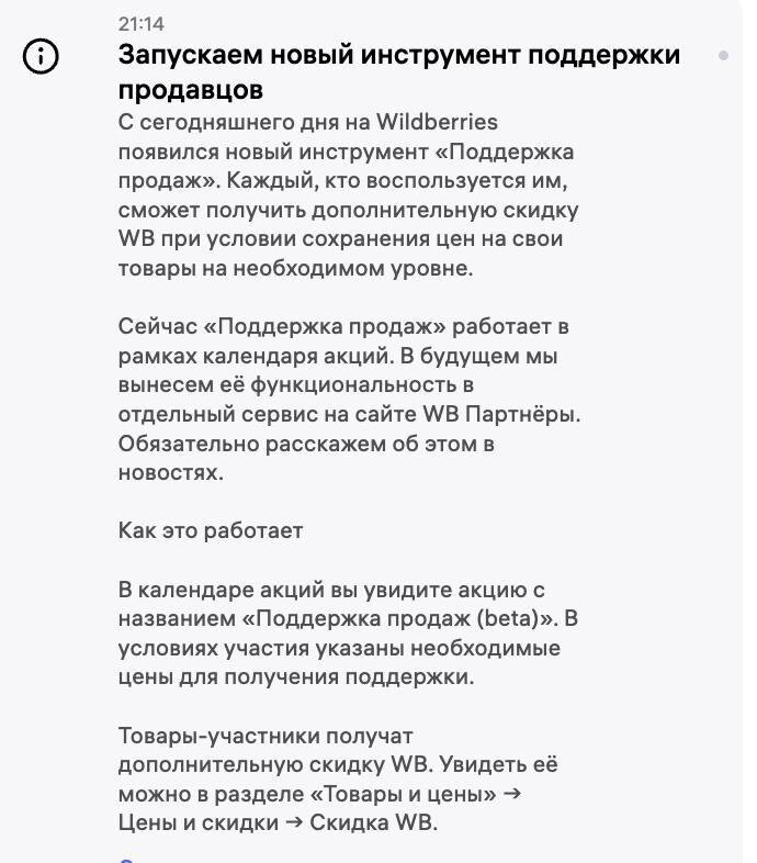 WB запустил новый инструмент «Поддержка продаж» С первого взгляда звучит красиво: якобы дополнительная поддержка для селлеров. Но если копнуть глубже, видно новый этап принуждения к скидкам. ✔ Сначала WB прямо заставлял снижать цены. ✔ Потом начал «мотивировать» — обещал поднятие в выдаче и увеличение СПП. ✔ Теперь ещё изощрённее: снижать цены вроде как не просят, но требуют их зафиксировать. А если курс доллара подскочит или вырастут издержки — риски ложатся на селлера. По сути, «поддержка» — это всё тот же СПП, только в новой обёртке. Игра в кошки-мышки с ФАС продолжается. Слово «поддержка» здесь звучит особенно иронично. Marketplace_biz - отдай свой буст каналу