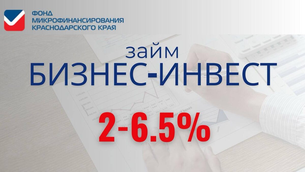 Займ «Бизнес-Инвест»: инвестиции в развитие бизнеса Фонд микрофинансирования Краснодарского края предлагает предпринимателям воспользоваться займом «Бизнес-Инвест» — это инструмент, который помогает реализовать амбициозные планы и укрепить бизнес. 🔹 Основные условия: * сумма займа — от 100 тыс. до 5 млн рублей; * процентная ставка — от 2 % до 6,5 % годовых; * срок возврата — до 36 месяцев. 🔹 На что можно направить займ: * приобретение оборудования и техники; * закупка производственных линий и инструментов; * покупка автотранспорта для ведения бизнеса; * модернизация помещений, ремонт и оснащение рабочих зон; * внедрение новых технологий и развитие инфраструктуры предприятия. 📌 Такой инструмент позволяет предпринимателям Краснодарского края инвестировать в долгосрочные проекты, увеличивать объёмы производства и предоставлять качественные услуги жителям. ℹ️ За консультацией предприниматели могут обратиться: в Фонд микрофинансирования Краснодарского края по телефону: +7(861) 298-0
