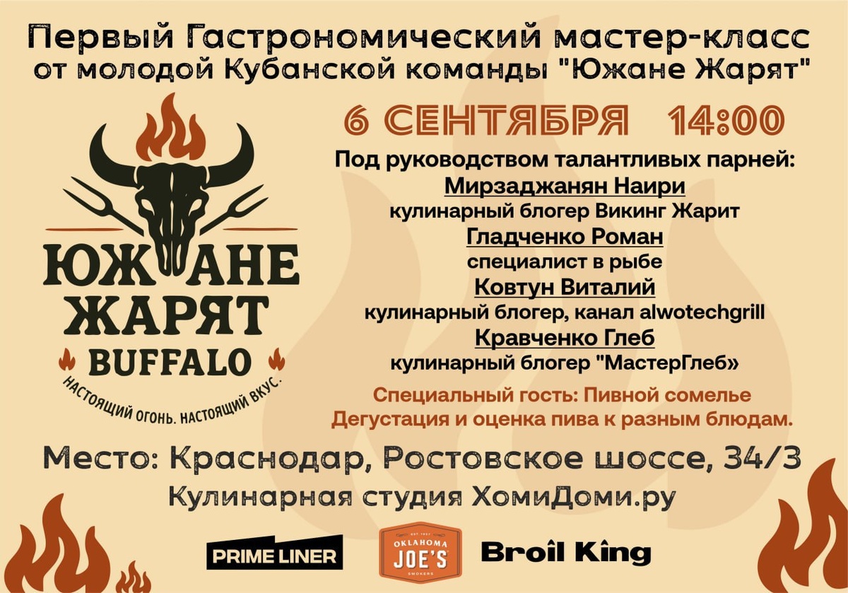 ‼️‼️‼️‼️ 6 сентября 2025 | 14:00 | Краснодар, Ростовское шоссе 34/3 (территория ХомиДоми.ру" 🔥🔥🔥 Первый Гастрономический мастер-класс от молодой Кубанской команды "Южане Жарят". Новый проект ценителей Барбекю культуры. Эксклюзивный интерактивный формат мастер-класса, совместно с брендами 🐄PRIMEBEEF — эксперта по мраморной говядине. 🦆 Утка Маршрутка - наша Кубанская птица Что нас ждет: BEER сопровождение — совместно с сомелье подберем идеальную пару из Европейского и Российского Пива. Живое общение и атмосфера — совместная разработка рецептов с единомышленниками, в окружении вкуса, аромата и профессионализма. Под руководством талантливых парней ✅Мирзаджанян Наири - Кулинарный блогер Викинг Жарит ✅Гладченко Роман - специалист в рыбе ✅Ковтун Виталий - Кулинарный блогер, канал alwotechgrill ✅Кравченко Глеб - Кулинарный блогер "МастерГлеб" Что будем готовить: 1 Альтернативные бургеры - на керамическом гриле 2 Рыба в балийском соусе - на газовом гриле 3 Утиный пастрами - подкопчены