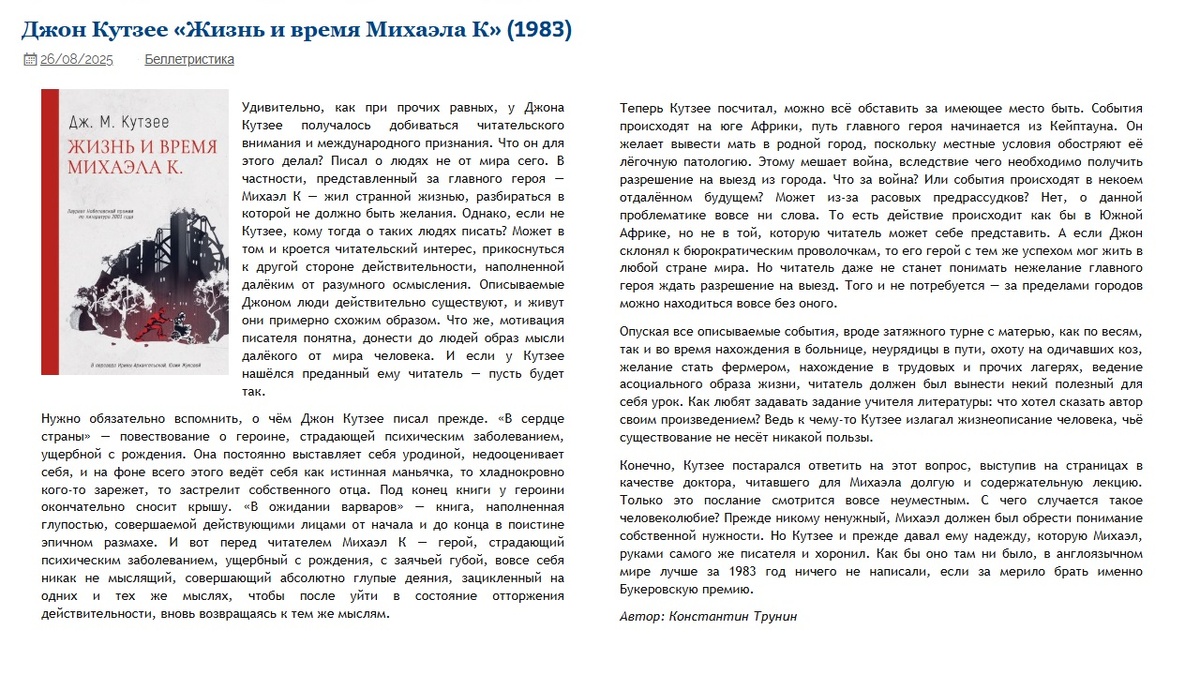 Джон Кутзее «Жизнь и время Михаэла К» Критика