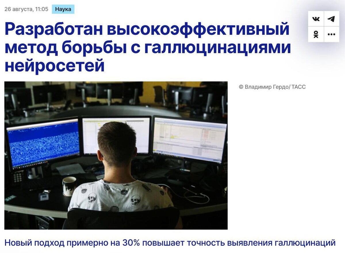В России предложили эффективный метод для выявления галлюцинаций в больших языковых моделях. Учёные из Сбера создали подход, который на 30% точнее, чем другие локальные решения, в обнаружении ошибок в ответах LLM, используя при этом минимальное количество обучающих данных. Вместо огромного объёма размеченной информации достаточно всего 250 примеров. Это достигается благодаря метамоделям и продуманной работе с внутренними состояниями искусственного интеллекта. В основе метода лежат классические алгоритмы машинного обучения и быстрые трансформеры, такие как TabPFNv2. Он отслеживает изменения в нейросети как при корректных ответах, так и в моменты, когда возникает галлюцинация. Инструмент можно применять как для отладки LLM, так и для снижения риска распространения дезинформации. Попробуйте метод, перейдя по ссылке. Наш уютный канальчик 🤖 Анимация | СhatGPT-4 | Помощь с резюме