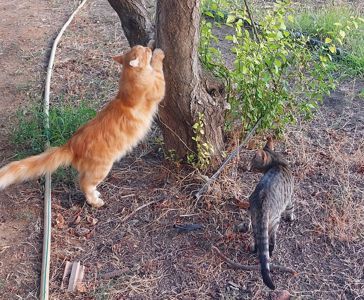 Сразу повышается работоспособность и хочется активных действий. Симба с Бубликом вышли на разминку. Дерево сливы выбрали вместо тренажера. Бублик за старшим бегает хвостом.