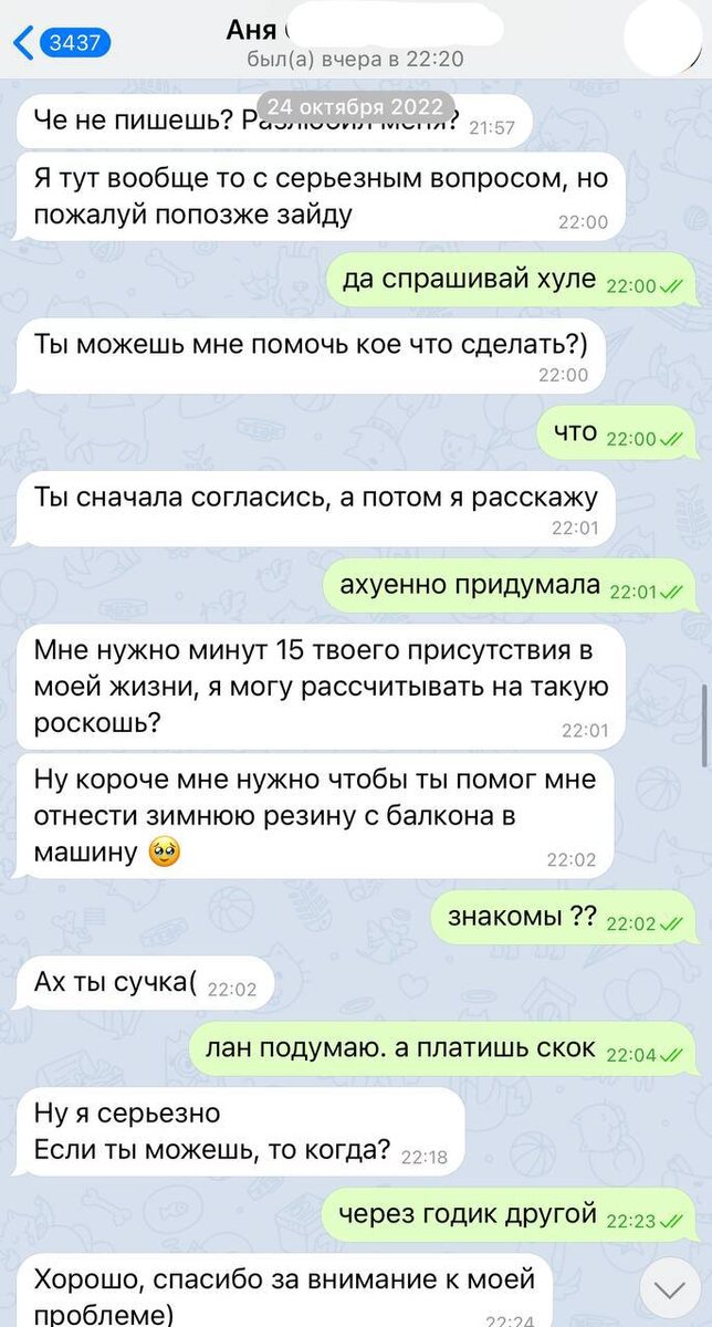 После этого мы не общались, а через месяц от скуки я ей решил пингануть, написав «переспим?» и как видите, отказа я не услышал.