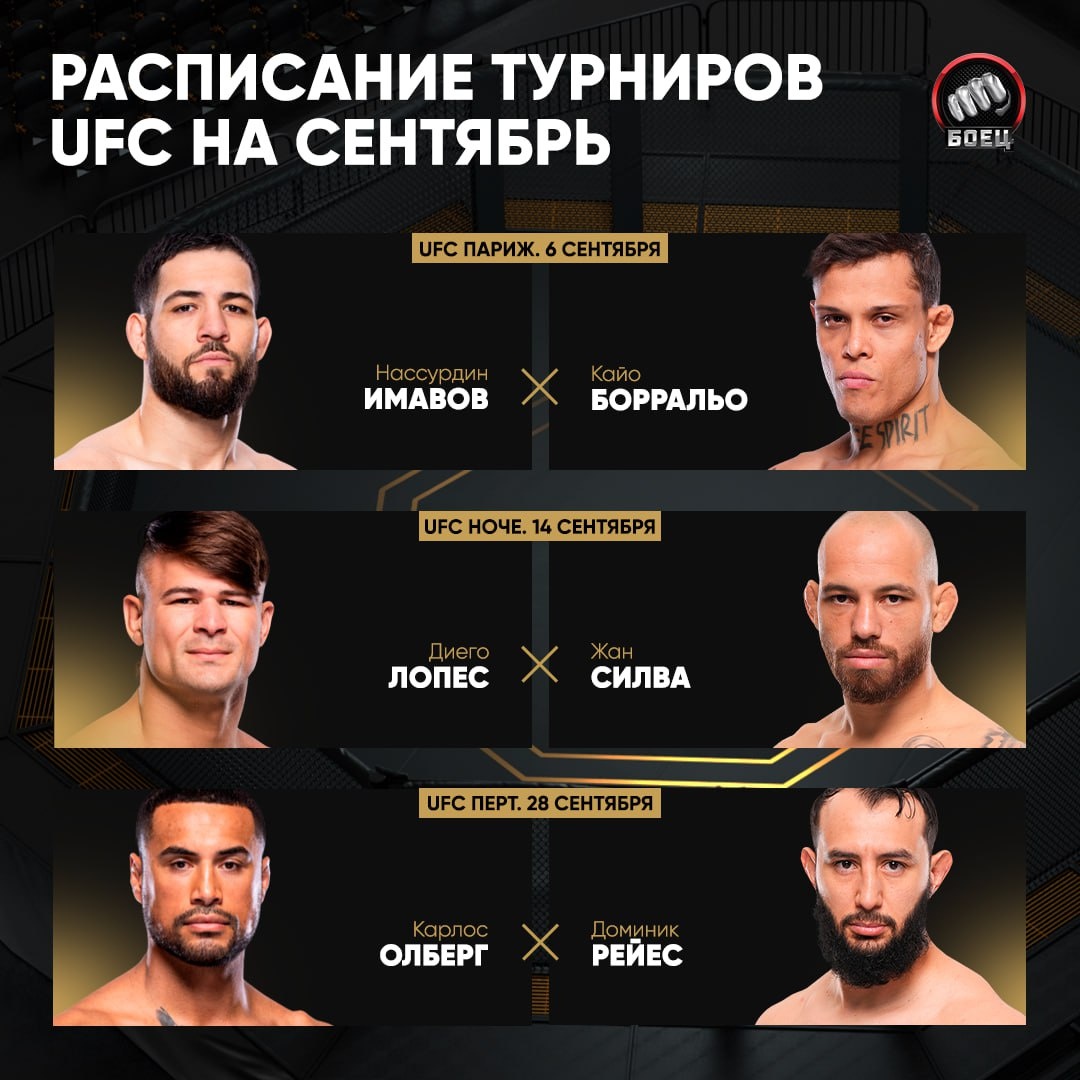 🗓Календарь турниров UFC на сентябрь Нас ждет всего три неномерных ивента 👊 6 сентября отправимся во Францию, где сойдутся два претендента на пояс в среднем весе 🏆 Затем 14 сентября посмотрим яркую зарубу Лопеса и Силвы 🔥 Ну а в конце месяца нас ждет турнир в Австралии. В главном событии разборка Олберга и Рейеса ⚔️
