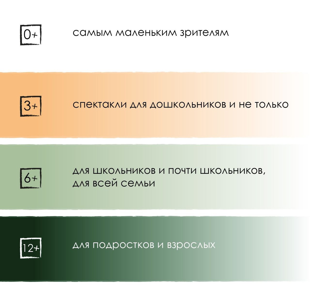 Каждый год мы чуть-чуть меняем дизайн наших афиш, сохраняя при этом фирменный узнаваемый стиль. Обратите внимание! Для удобства выбора спектакля мы придумали цветовой код: 🤍белым отмечены спектакли для самых-самых юных зрителей. 🧡оранжевый - цвет спектаклей для дошкольников, их мам, пап, бабушек и дедушек, а ещё старших братьев и сестёр. 💚зелёный - значит, спектакль идеально подойдёт для школьников и их родителей. И вообще для всей семьи! 🖤тёмно-зелёный - мы ждем на этих спектаклях подростков и взрослых. Так что скорее за билетами на сайт http://teatr34.ru/