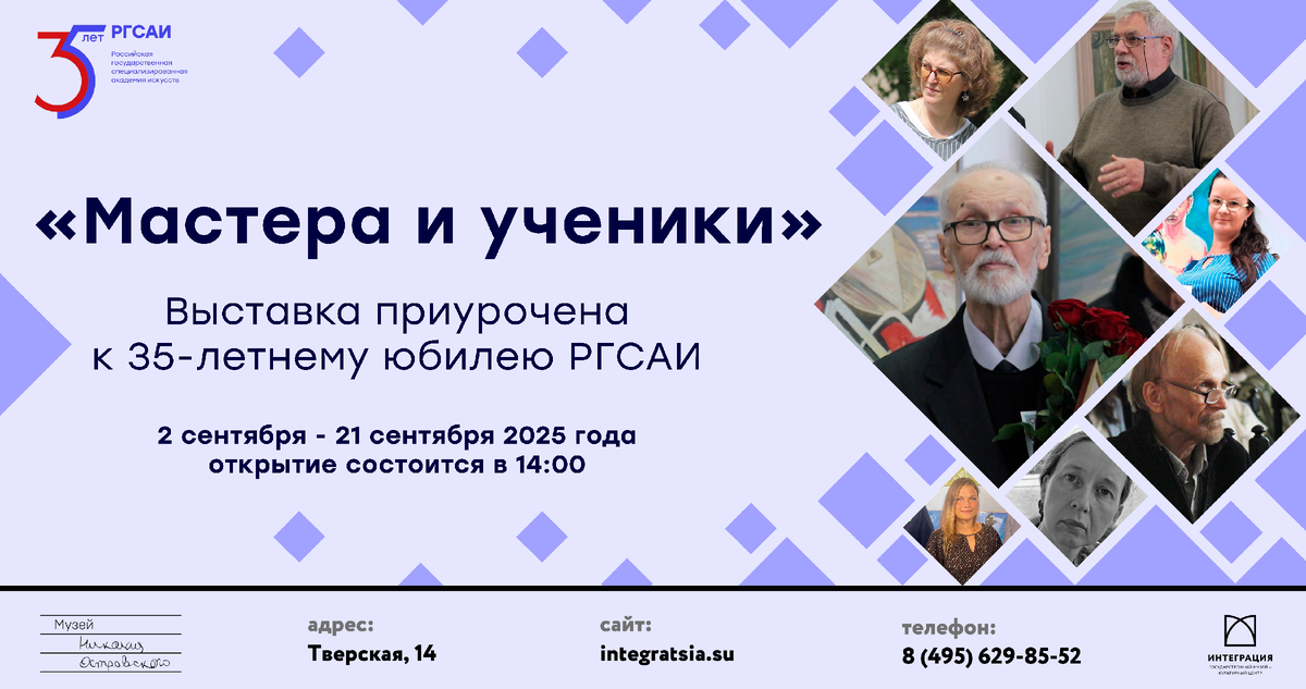 Друзья, приглашаем вас на выставку "Мастера и ученики", посвященную 35-летию нашей Академии! Она откроется 2 сентября в 14.00 часов в Государственном музее-культурном центре Интеграция имени Н.А. Островского по адресу: Москва, Тверская, 14. В экспозиции – лучшие работы преподавателей, студентов и выпускников РГСАИ. Среди них известные мастера, которые своим творчеством внесли большой вклад в отечественное искусство: академик Российской академии художеств, заслуженный художник РФ Олег Николаевич Лошаков; академик Российской академии художеств, заслуженный художник РФ Иван Алексеевич Полиенко; заслуженный художник РФ Николай Евгеньевич Комаров и другие деятели искусства. Мы ждем всех, кто искренне любит РГСАИ, чтобы разделить с вами радость этого большого и важного события! Вход свободный при предъявлении документа, удостоверяющего личность.
