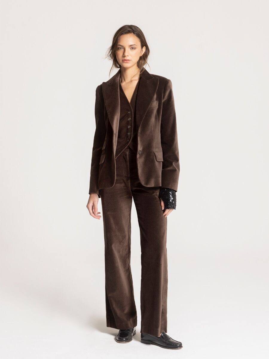 Плотный бархат с коротким стриженным ворсом в оттенке горького шоколада. Хорошо держит форму. На приталенный жакет, камзол, жилет.