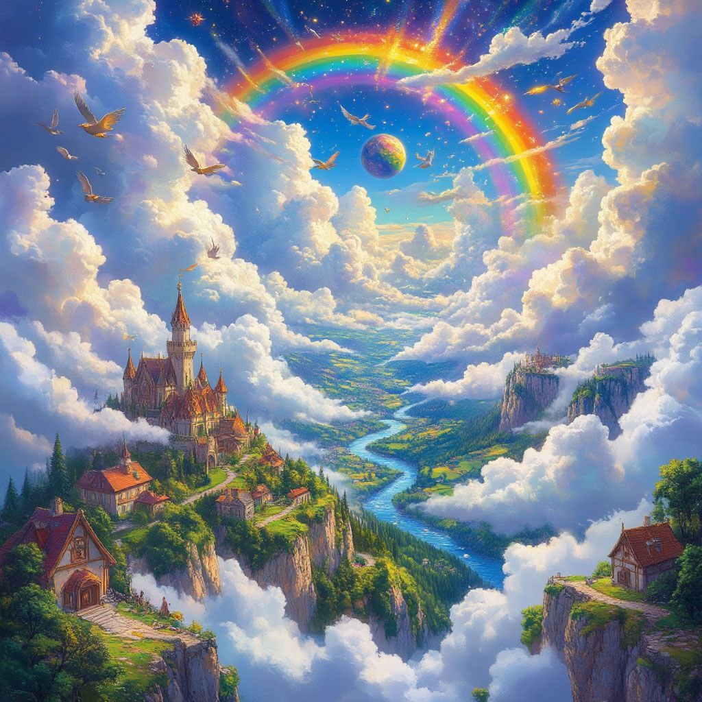 Высоко-высоко над облаками, там, где рождается радуга и живут солнечные зайчики, раскинулся дивный мир — Небесная Сфера. Это было место, где не было дорог, а только воздушные потоки, по которым жители передвигались на коврах-самолетах из пушистых облаков. Дома здесь строили из белых кучевых туч, а вместо рек текли серебряные струи солнечного и лунного света. В этом мире жила девочка по имени Арина. У нее были глаза цвета утреннего неба и смех, похожий на перезвон маленьких колокольчиков. Ее лучшим другом был необычный зверек — облакот. Его звали Пушинка. Он был сделан из белейшей ваты, умел менять форму и мурлыкать, как настоящий кот, только звук этот был похож на легкий ветерок. Однажды утром Арина проснулась и ахнула. Весь мир будто поблек. Небесная Сфера была серой и тусклой. Радуга потускнела и едва светилась, реки солнечного света стали бледными, а белые дома посерели. Самое страшное — звезды, которые всегда мягко мерцали даже днем, погасли. В мире воцарилась тишина, полная груст