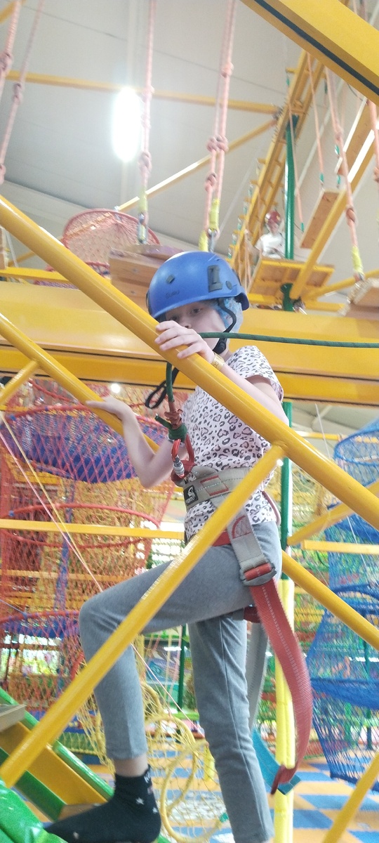 Всем привет! На пятый день дети запросили игровую комнату. Погода плохая, холодно, плюс 14, дождь идёт с периодичностью в полчаса. На море в такую погоду делать нечего. Хотели в Неопорт, Балтия Молл, как в прошлом отпуске, не понятно ничего, трубки не берут, в интернете вроде как, что они закрыты. Отправились в Рой Джой на Московском проспекте, большая игровая комната, мы там ещё не были. 43 батута, комнаты виртуальной реальности и разные скалодромы. Алиса попробовала прохождение подвесного парка, или как это называется, в Питере это Высотный город. Начала со второго яруса и забоялась, она ведь в первый раз, попросила спустить ее на первый, прошла по территории, по периметру, мы шли с ней рядом, я и Никита, иногда она просила взять ее за руку. Потом дети залазели вот в такие вот штуки, я называю их вязанными: В них не так страшно, даже без страховки, всегда есть за что зацепиться. Потом прыгали на спортивных батутах, скатывались с горки в сухой бассейн с шариками, и вовсю веселились