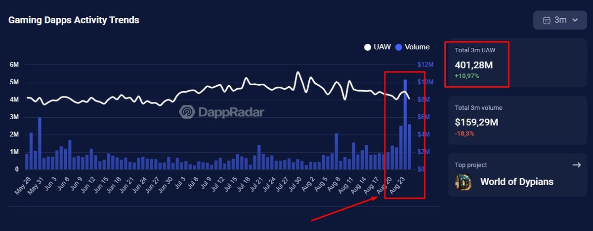 P2E оживает? 🧐 Ранее я писал о том что лето — исторически самое худшее время для сферы P2E и что скорей всего мы получим оживление ближе к середине сентября На скрине выше мы видим активность за последние 3 месяца в сфере Web3 гейминга, как видно на картинке мы уже начинаем получать всплеск активности к концу августа.. Вероятно это тенденция сохранится до конца осени, после чего ближе к зиме снова пойдет на спад Что это значит для нас? В ближайшее время разрабы будут выпускать проекты, которые они билдили все лето, т.к запускаться на тухлом рынке никто не хочет, а когда они видят активность и интерес со стороны пользователей — они готовы показать то, над чем работали последние 3-6 месяцев Вывод: Активно следим за сферой, т.к с большой вероятностью в ближайшее время увидим больше проектов, которые могут принести потенциальный профит🫡 #P2E
