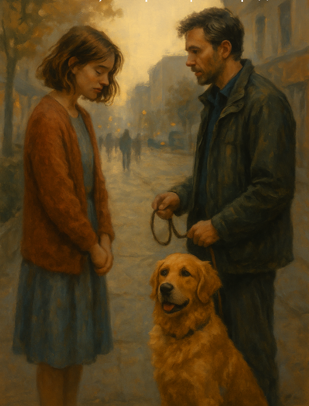 И именно в этот момент, когда она снова погрузилась в свои тяжёлые мысли, прямо перед ней остановился мужчина. В руках он держал собаку на поводке - крупного золотистого ретривера. Собака тянула вперёд, но мужчина выглядел так, будто всё вокруг давило на него тяжёлым грузом.