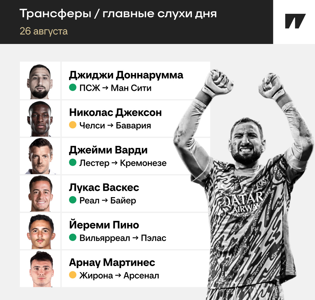 «ПСЖ» согласен продать Джанлуиджи Доннарумму за 30 млн евро. «Ман Сити» готов заплатить эту сумму. Вратарь не против продолжить карьеру в АПЛ, стороны достигли принципиальной договоренности. При этом «Сити» продолжает вести переговоры с «Галатасараем» о трансфере Эдерсона. Уход бразильца – ключевое условие для заключения сделки по Доннарумме.