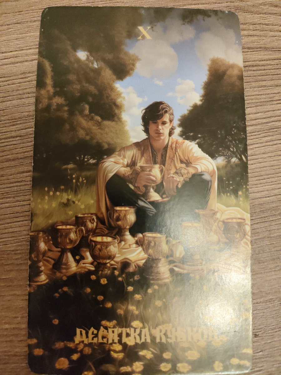 Десятка Кубков предвещает время, когда коллективное сознание стремится к примирению, состраданию и взаимопониманию. Она сигнализирует об уходе от конфликтов и недоразумений, замене их сотрудничеством и поддержкой. Это период обретения внутренней гармонии и налаживания отношений с окружающими.