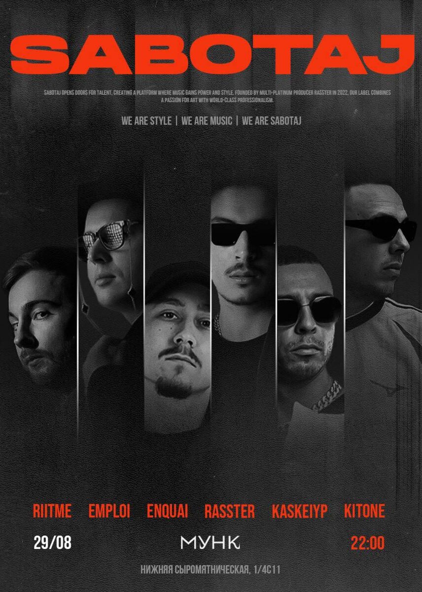 SABOTAJ: первая ночь Москва, готова? 29 августа в Мунке саботируем тишину и запускаем первую вечеринку от лейбла SABOTAJ Один зал, один вайб, один звук. Line-Up: EMPLOI Kaskeiyp Riitme Rasster Kitone Enquai Подробности в ТГ и по тел. +7(999)558-78-89 🎫 Билеты 📆 29 августа, 22:00 — 05:30 📍Бар Мунк, Москва, Нижняя Сыромятническая 1/4с111