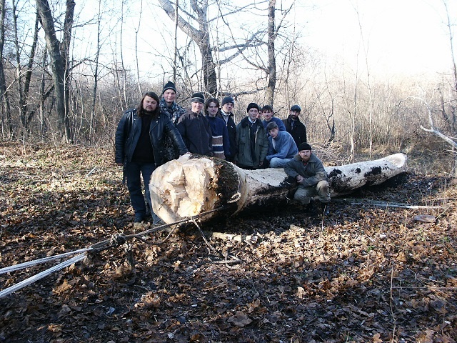 Приехав утром вдесятером, начали сбор конструкции. Нам помогали археологи из ЛГПУ и один наш кореш байкер. Мимо опять проходили граждане, бойко комментируя наши приготовления. Вставили бревно, заправили канат, начали крутить ворот. Канаты натянулись и загудели, блоки пощёлкивали, кряхтели, а бревно лежало и... никуда не ехало.