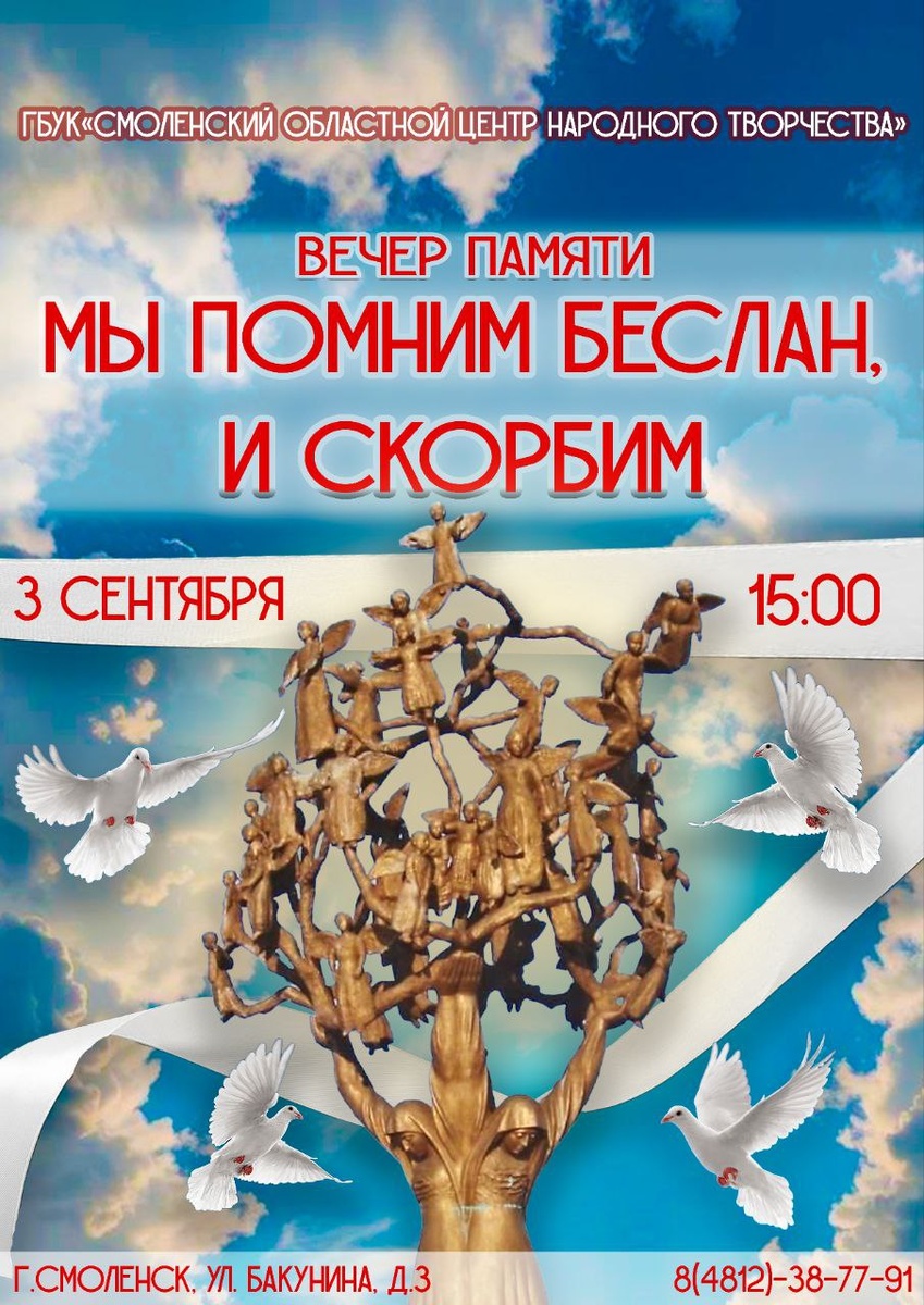 🥀3 сентября в 15:00 приглашаем на вечер памяти «Мы помним Беслан и скорбим», приуроченный ко Дню солидарности в борьбе с терроризмом. В память обо всех погибших от рук террористов прозвучат музыкальные и творческие композиции в исполнении самодеятельных коллективов Смоленска и артистов Центра народного творчества. Вход свободный 📍Адрес: ул. Бакунина, 3 ☎️Телефон: 38-77-91 #СмоленскийЦентрНародногоТворчества