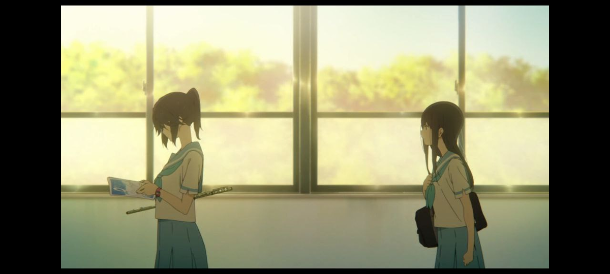 Мидзорэ играет на гобое, Нодзоми на флейте. После занятий Мидзорэ бе тени сомнения отвергает приглашение гобоисток пойти в кафе, Нодзоми же, напротив, само собой разумеющимся считает пойти погулять с флейтистками.