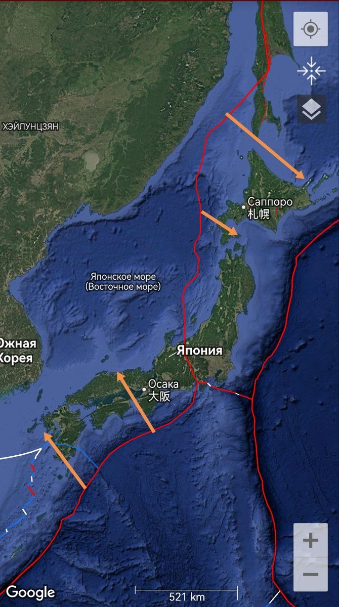 Также над Японским морем со смещением на северо-запад сформировался трассер от разломов над Кюсю и южной частью Хонсю (фото 3-4).