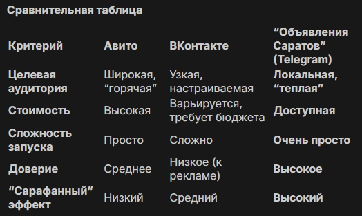 Перед каждым предпринимателем в Саратове встает вопрос: где разместить объявление, чтобы получить максимальный отклик? Три гиганта борются за ваше внимание: Авито, ВКонтакте и Telegram. Мы провели честный разбор этих площадок и пришли к выводу, что для многих задач локального бизнеса Telegram-канал “Объявления Саратов” становится самым эффективным и рентабельным решением. Введение: Битва за внимание клиента в Саратове Выбор рекламной площадки – это стратегическое решение, которое напрямую влияет на успех вашего продвижения в Саратове. Неправильный выбор – это слитый бюджет и упущенные клиенты. Давайте без прикрас рассмотрим плюсы и минусы каждой из трех популярных платформ для размещения объявлений в Саратове. Платформа 1: Авито Платформа 2: ВКонтакте (таргет и маркетплейс) Платформа 3: Telegram-канал “Объявления Саратов” Минусы: Нет сложного таргетинга. Вы обращаетесь ко всей аудитории канала сразу (что, впрочем, часто является плюсом для локальных предложений широкого спроса).