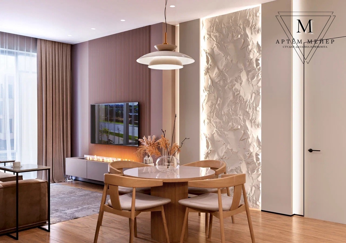 Интерьер кухни-гостиной выполнен в современном минималистичном стиле с преобладанием натуральных материалов и светлых тонов. Кухонная зона выделена деревянными фасадами шкафов, мраморным фартуком и встроенной техникой. В центре обеденной зоны расположен круглый стол с деревянными стульями, над которым висит лаконичный подвесной светильник. Гостиная зона представлена мягким диваном серого цвета, дополненным подушками, и минималистичным декором на стене. Пространство наполнено светом благодаря встроенному освещению и большому окну.