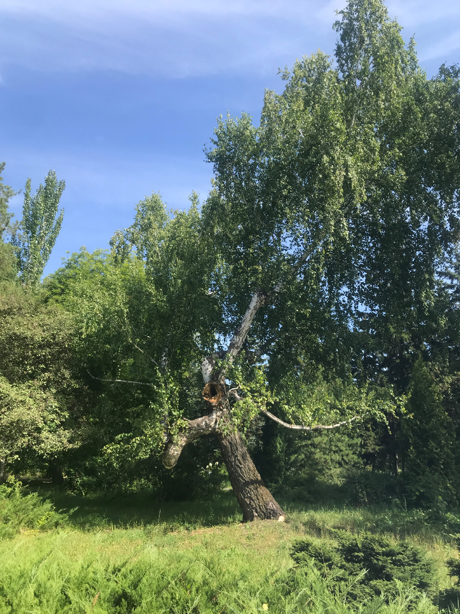 Как оказывается, интересно и даже приятно гулять по паркам, в которые давно не захаживала. Первым делом, конечно, начинаешь сравнивать реальную обстановку с хранившейся в памяти. Интуитивно хочется увидеть улучшение и развитие, но такое происходит далеко не всегда, к сожалению. 🤗 В Ботаническом саду не была, наверное, лет пять, если не больше. Стал ли он лучше? Лично для меня это спорный вопрос. С одной стороны, некоторые ранее заброшенные территории приведены в порядок, расставлены лавочки, сформированы дорожки. Вроде как, видится перспектива развития. 🤔 С другой стороны, кардинально изменилась атмосфера сада. И это для меня стало печальной новостью... Нет былого ощущения уюта и уединения, чувства, что ты находишься в уголке дикой природы. 😔 И лишь некоторые насаждения возвращают к давно пережитым эмоциям и воспоминаниям. Это дерево я хорошо помню стройным, ровным, высоким, правильной формы. А теперь оно, будто выйдя на забастовку, демонстративно изменило свою форму. 😯 Я виж