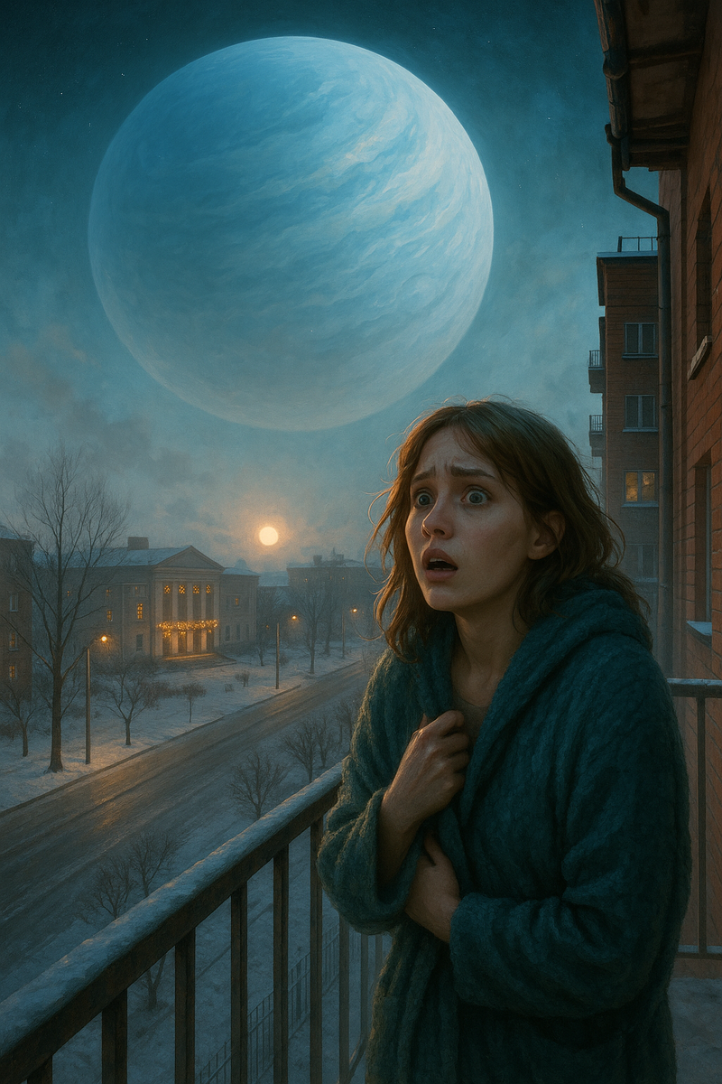 Она слышала разговоры, она видела новости, но пыталась избегать всех фотографий. Но вскочив в восемь утра, когда рассвет только набирал обороты, Майя не смогла совладать с собой и вышла на промёрзший балкон, чтобы посмотреть на небо. Утро было безоблачным. Но отвратительно жутким. Она с тревожным трепетом смотрела на то, как чуть выше солнца висела, как нелепо приклеенная картинка, огромная голубая планета. Она уже была вдвое больше утреннего солнца. И выглядело это страшно неестественно. Морозная дымка, окружавшая всё вокруг, сжирала объем. От того Майя вскользь подумала о том, что может просто перед её окном на улице растянут огромный баннер с рекламой нового фантастического фильма.