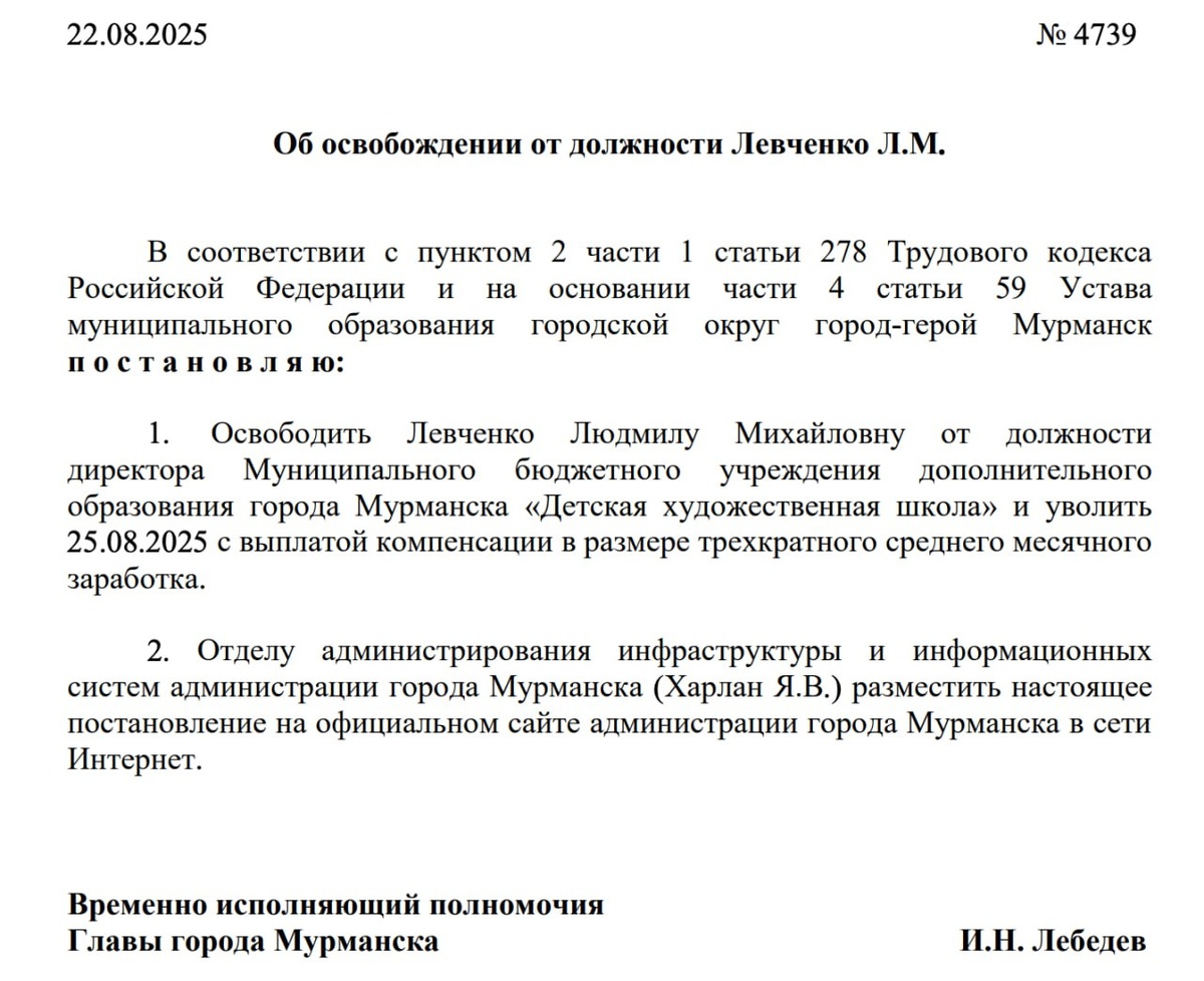 В ответ на пост С Людмилой Левченко окончательно расстались: врио главы города Иван Лебедев освободил её от должности директора художественной школы. Отмечу, что постановление о прекращение полномочий Левченко появилось на сайте горадминистрации задним числом. ❄ «Арктический Обозреватель»