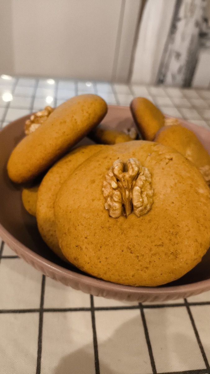 - Тесто брать руками, скатывая, кружочки и расплющить на протвине, я украсила орешком. Выпекаем 10 минут при 180 градусах.