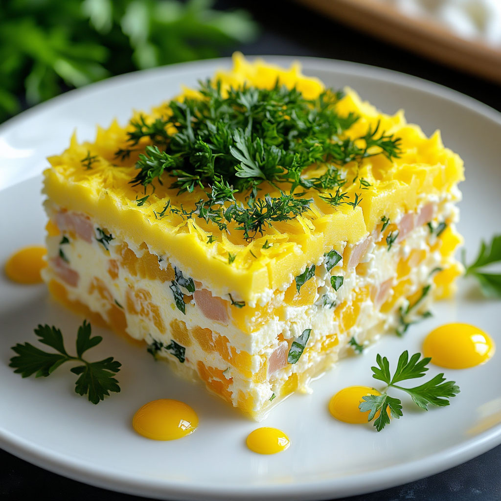 - Можно добавить слой тёртого сыра (100 г) между белками и желтками
