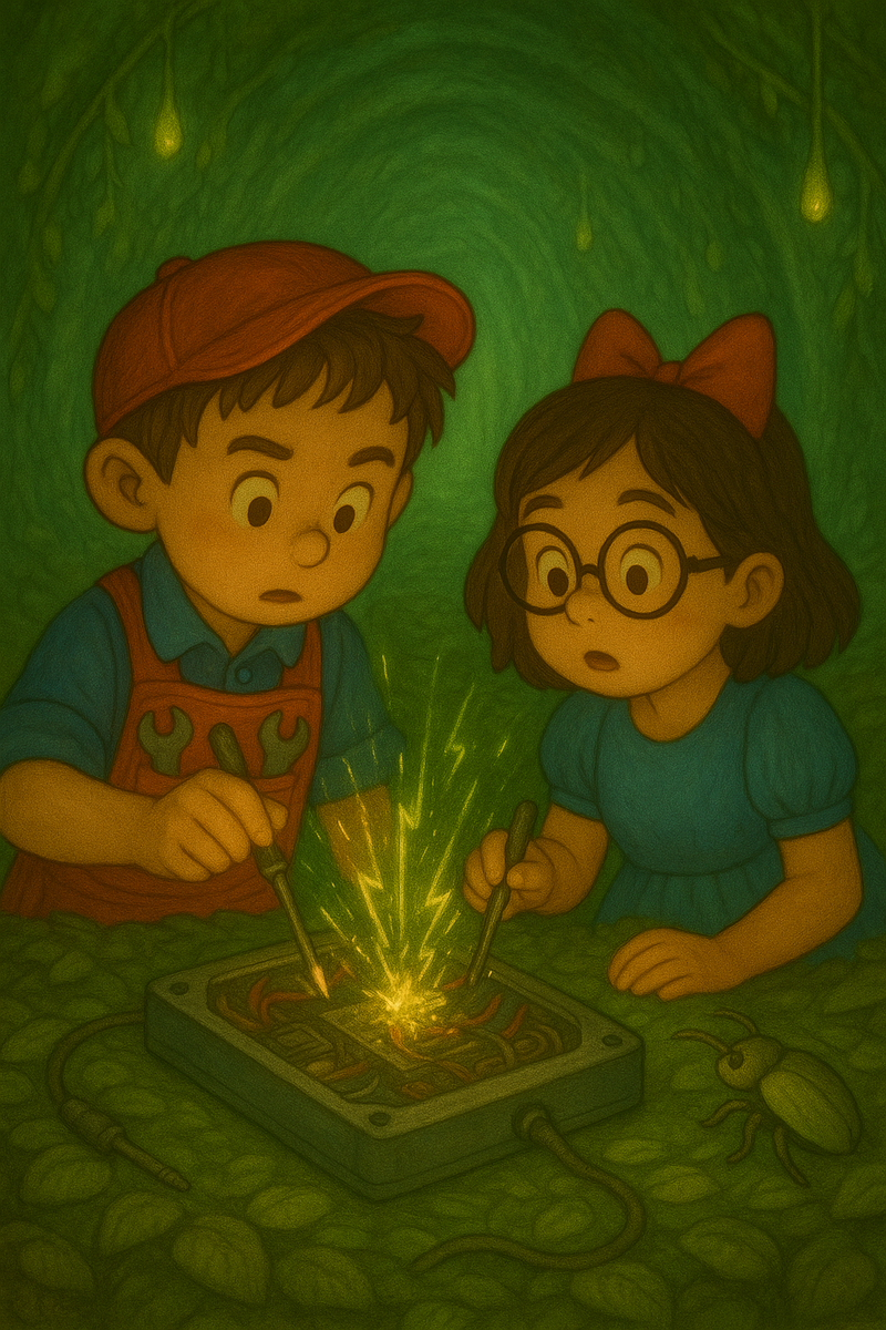 Зелёный коридор вздохнул листвой и стих. Таинственный страж исчез, будто растворился в воздухе. Болтик и Шайбочка остались вдвоём — только жук-электрик тихо потрескивал усиками. — Ну и что теперь? — спросила Шайбочка, озираясь. — Мы ведь ищем Клёпочку, а вместо неё получили загадки. В этот момент Хоппер в руках Болтика жалобно заскрежетал. Кнопки мигнули красным, корпус дрогнул, и прибор будто захрипел. — Ой-ой… — Болтик присел прямо на мшистый пол. — Кажется, он перегрелся. Шайбочка встревоженно заглянула внутрь. Пайка потемнела, одна из катушек потрескалась, и искры сыпались прямо в ладонь. — Если он совсем сломается, мы не сможем дальше идти, — шёпотом сказала она. Болтик уже раскладывал инструменты. Но вдруг, когда он отодвинул обгоревшую панель, изнутри Хоппера выпал маленький свернутый клочок бумаги. Шайбочка подхватила его. На бумаге торопливыми буквами было написано: «Я жива. Не сдавайтесь. Найдите меня. — К.» — Клёпочка! — воскликнули они в один голос. Болтик крепче сжал отвё