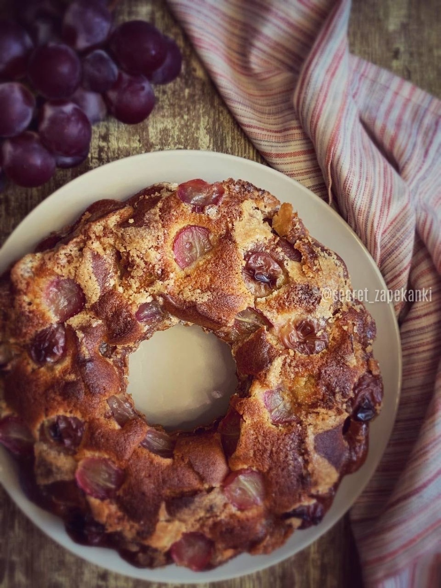 Не знаю, почему мы не используем свежий виноград в выпечке, а ждём пока он станет изюмом. Очень зря, я вам скажу. У него получается интересная и приятная желейно-вяленая консистенция. В идеале нужно брать виноград без косточек. Но я наткнулась в магазине на крупный, мясистый Ред Глоб и не смогла пройти мимо. А вытащить косточки из него – это дело пары минут. Главное, чтобы виноград был розовым. Всё в этом пироге как надо и к месту. И влажность, и рассыпчатость, и ароматность. И цедра, возможно кем-то не любимая в выпечке, здесь звучит безупречно, а хрустящая корочка выше всяких похвал. Однозначно в избранное! Берём: - виноград розовый 100 г - мука 250 г и немного для посыпки формы - разрыхлитель 1 ч. л. - сода пищевая 1/3 ч. л. - соль 1/4 ч. л. - сахар 170 г - масло сливочное 90 г и немного для формы - масло оливковое 40 г - цедра одного лимона - цедра одного апельсина - ванилин 1 пакетик - яйцо СО 2 шт. - сок виноградный 250 мл Для корочки: - масло сливочное 70 г