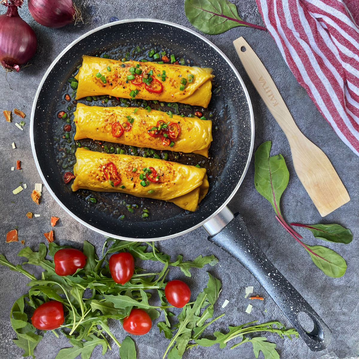 ✅ Яйца - 4 шт. ✅ Сыр твёрдый (любой, натёртый) - 100 г ✅ Помидоры - 1 шт. ✅ Масло сливочное - 20 г ✅ Соль - по вкусу ✅ Перец чёрный молотый - по вкусу ✅ Зелень (укроп или петрушка) - по вкусу ▪️Нарезаем помидор мелкими кубиками — немного тушим их заранее. ▪️Взбиваем яйца с щепоткой соли и перца до однородной массы. ▪️Растапливаем половину сливочного масла на сковороде DREAM STONE c красивым антипригарным покрытием под камень. ▪️Выливаем половину яичной смеси, распределяем тонким слоем и жарим омлет 2–3 минуты, пока верх не схватится, но останется слегка мягким. ▪️Посыпаем половину омлета натёртым сыром и выкладываем половину нарезанных помидоров. ▪️Аккуратно заворачиваем омлет в конвертик, складывая края к центру. ▪️Повторяем процесс с оставшейся яичной смесью, маслом, сыром и помидорами. ▪️Украшаем готовые конвертики измельчённой зеленью. 🔥 Подаём горячими. Приятного аппетита!