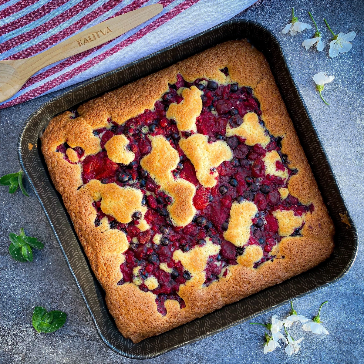 Кисло-сладкий ягодный пирог не продержится на вашем столе ни одной лишней минуты! Это очень вкусно. ✅ 2 яйца ✅ 200 г сахара — так как у нас кислые ягоды ✅ 1 пакетик ванильного сахара — всё взбиваем в пену ✅ 85 г мягкого сливочного масла ✅ 100 г теплого молока — также взбиваем и добавляем к яичной смеси ✅ 1/2 ч.л. соды (уксусом гасить не нужно) ✅ 1/2 пакетика разрыхлителя ✅ 240 г муки — также добавляем к чашу с тестом. ▪️ полученное тесто выкладываем в новый квадратный противень линейки DREAM (28х28 см) и разравниваем. ▪️ ягодную смесь (500 г) размораживаем, сливаем сок, хорошо отжимаем. Присыпаем немного сахарной пудрой (2 ст.л.) и 1 ст.л. с горкой крахмала. Если жидкости слишком много, можно также добавить пару столовых ложек панировочных сухарей. Главное, чтобы ягоды органично пропеклись с тестом, не делая его мокрым. Пирог итак будет очень сочным. ▪️ ягоды выкладываем сверху и запекаем при температуре 190˚ около получаса или чуть больше. ⠀ Приятного чаепития!